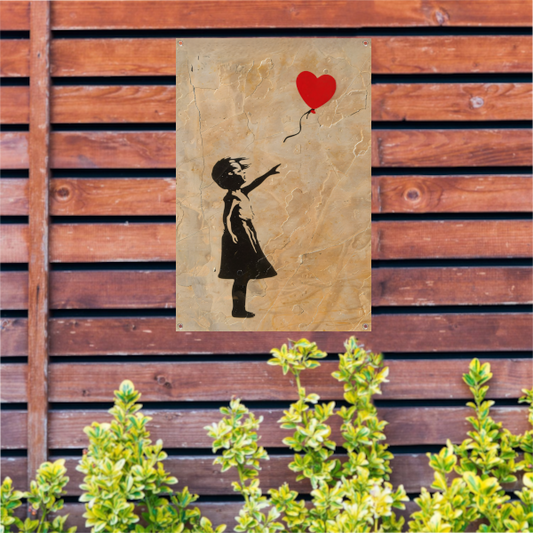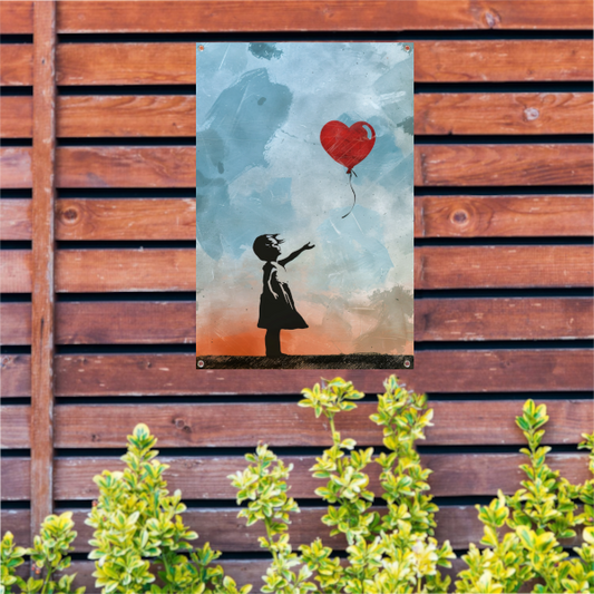 Silhouet van meisje met rode hartvormige ballon tuinposter