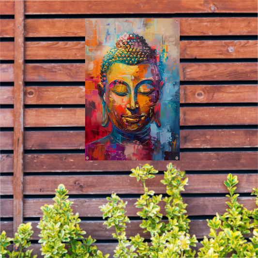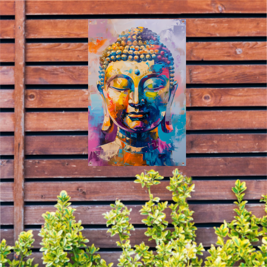 Abstract en kleurrijk Boeddha hoofd schilderij tuinposter