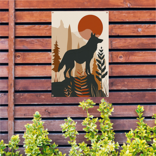 Stilistische wolf met zonsondergang in eenvoudige vormen tuinposter