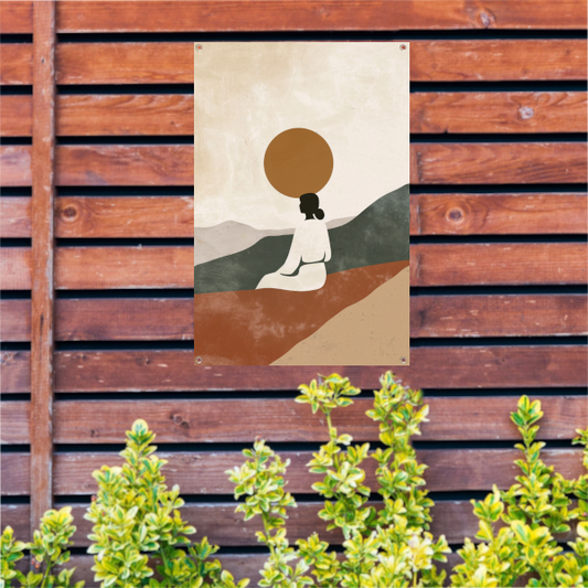 Contemplatieve vrouw in minimalistisch landschap tuinposter