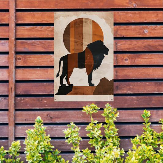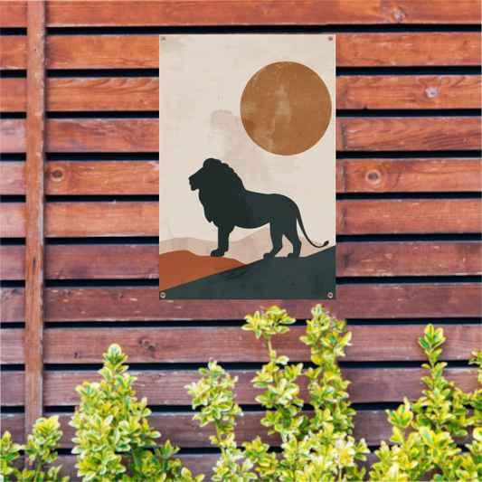 Leeuw silhouet tegen oranje zon in minimalistische stijl tuinposter