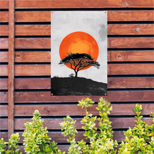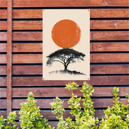 Minimalistische boom en zon in krachtige contrasten tuinposter