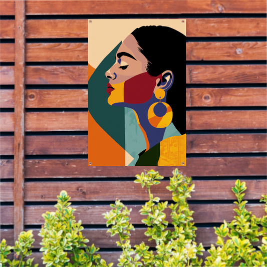 Modern vrouwelijk portret met kleurrijke oorbellen tuinposter