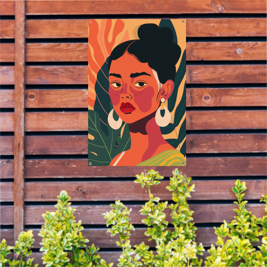 Elegante vrouw met tropische planten achtergrond tuinposter