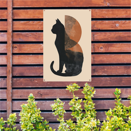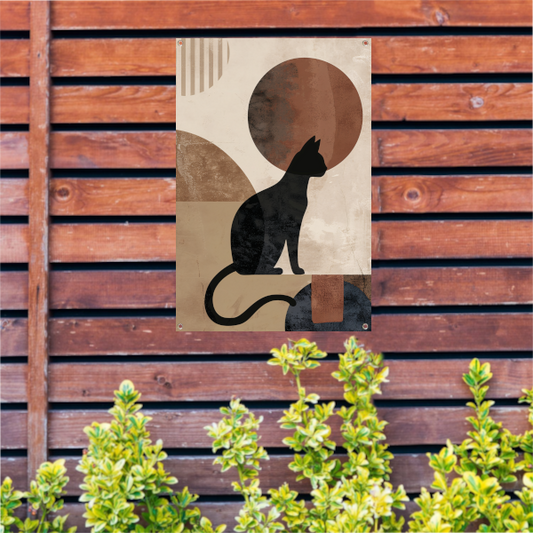 Minimalistische zwarte kat tegen een abstracte achtergrond tuinposter
