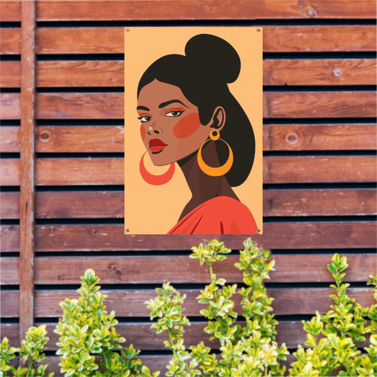 Elegante Dame in Rood met Gouden Oorbel tuinposter