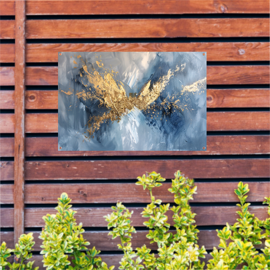 Dynamische abstracte gouden vleugels op blauw tuinposter