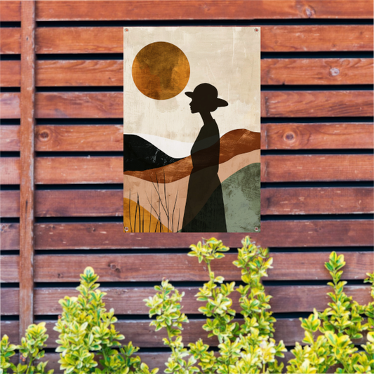 Vrouwelijk silhouet met abstracte natuur en warme kleuren tuinposter