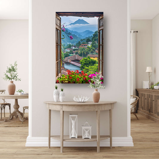 Vulkanisch landschap met bloemen bij zonsopgang poster