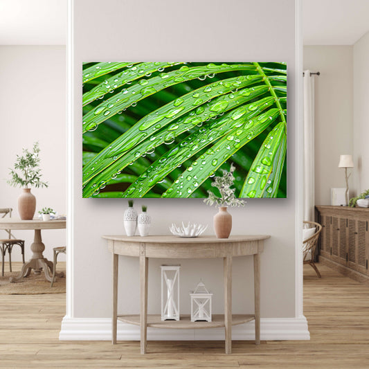 Close-up van groene bladeren met dauwdruppels acrylglas