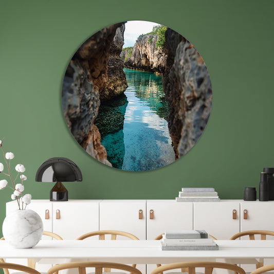 Zeezicht vanuit een grot met turquoise water aluminium muurcirkel