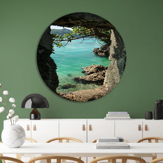 Uitzicht op zee door stenen raam aluminium muurcirkel
