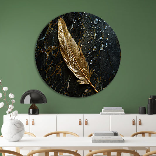 Gouden veer met waterdruppels op donker marmer aluminium muurcirkel