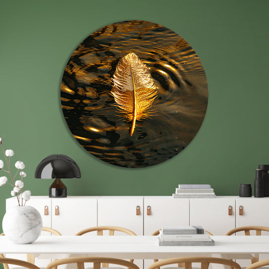 Gouden veer op donkere wateroppervlakte bij zonsondergang aluminium muurcirkel