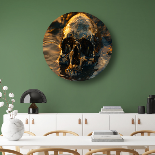 Vergulde schedel rustend in schemerig water aluminium muurcirkel