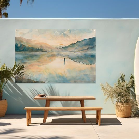 Vissersfiguur bij mistige bergmeer zonsopgang tuinposter