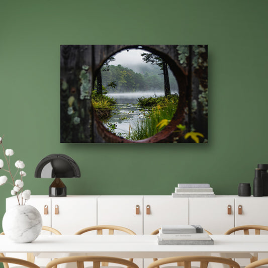 Mistig meer door een rond venster canvas