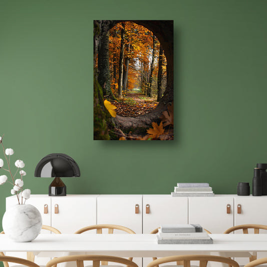 Herfstbos door een holle boom canvas