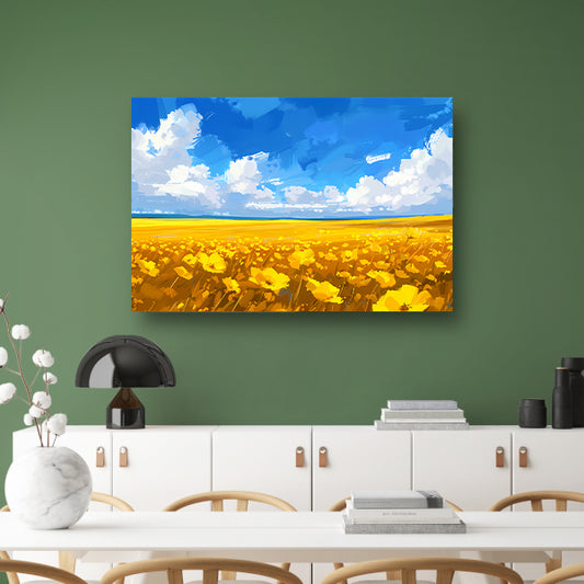 Schilderij van bloemenveld onder blauwe lucht acrylglas