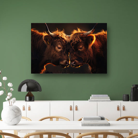 Twee Schotse Hooglanders bij zonsondergang acrylglas