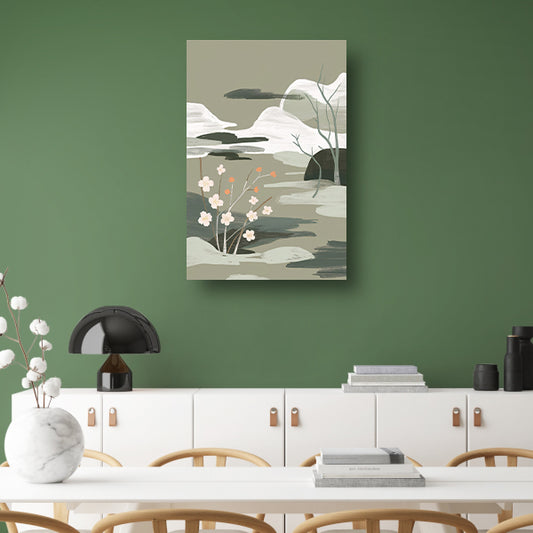Minimalistisch schilderij met bloesems en bergen acrylglas