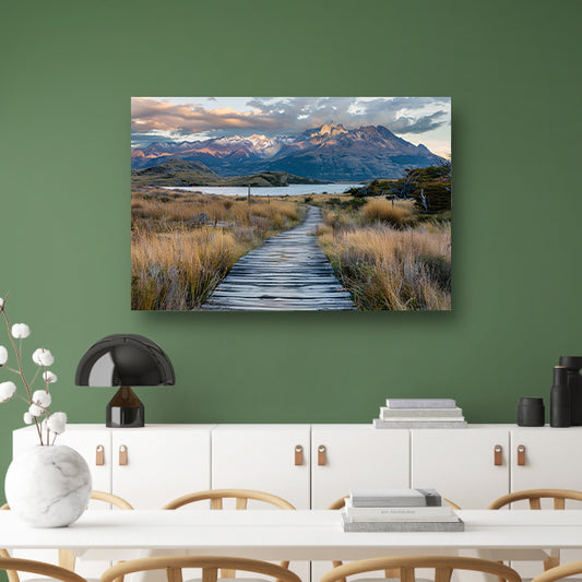 Prachtig Patagonisch landschap met houten pad acrylglas