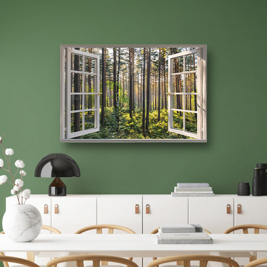 Open raam met uitzicht op een zonovergoten bos acrylglas