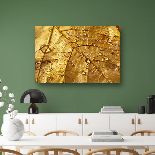 Waterdruppels op goudkleurig blad in detail acrylglas