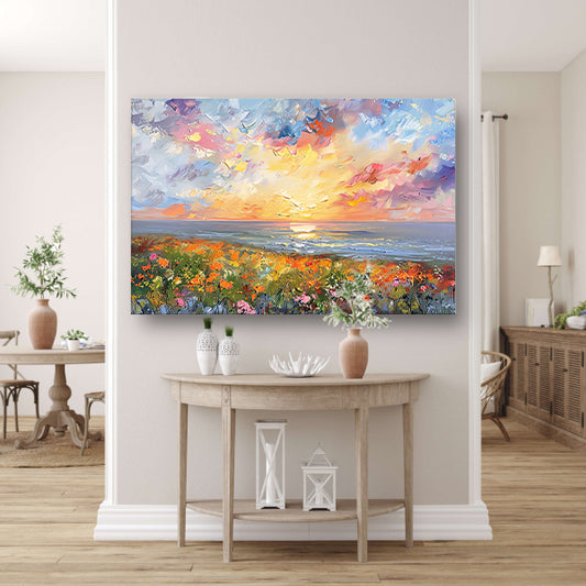 Abstracte zonsondergang met bloemen en oceaan acrylglas