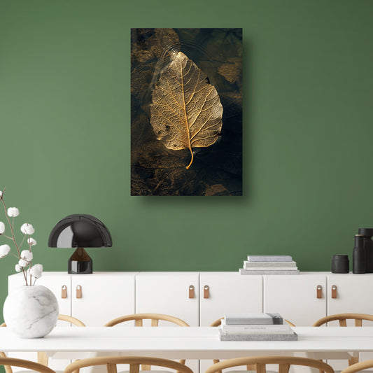 Blad met gouden nerven drijft op donker water acrylglas