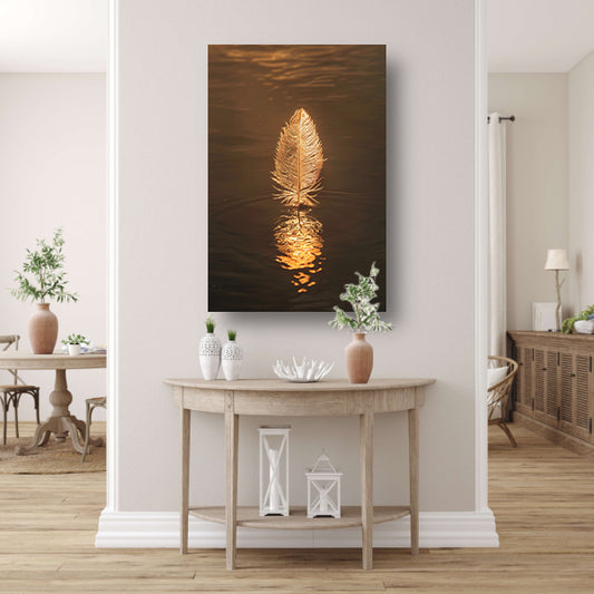 Gouden veer op donkere wateroppervlakte bij zonsondergang acrylglas
