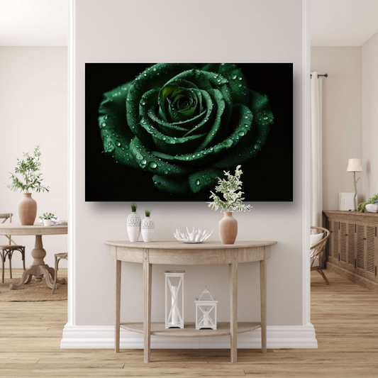 Donkergroene Tulp met Dauw op Zwart acrylglas