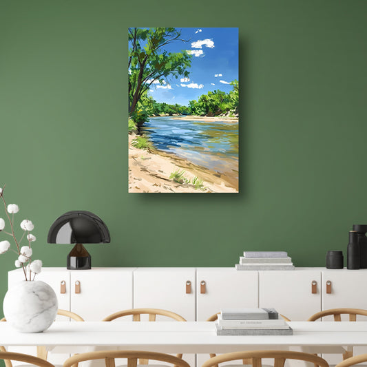 Kleurrijk minimalistisch schilderij van rivier en bergen canvas met baklijst