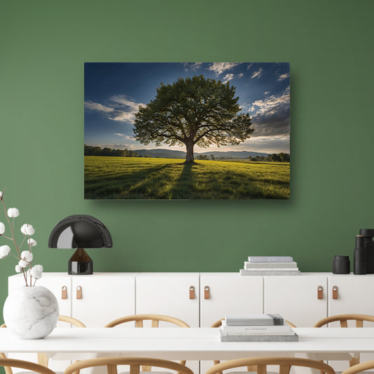Majestueuze boom in uitgestrekt landschap canvas met baklijst