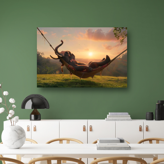 Olifant in een hangmat tijdens zonsondergang acrylglas