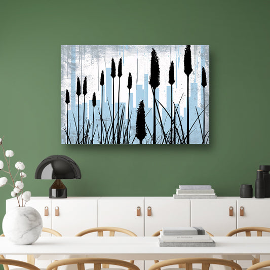 Minimalistisch silhouet van planten en skyline canvas met baklijst