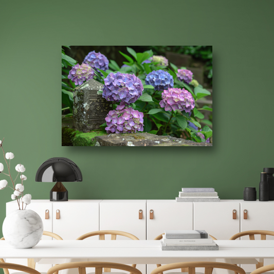 Slapende kat in bloemenrijke tuin canvas met baklijst