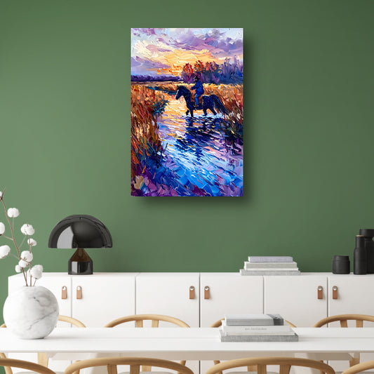 Ruiter op paard bij zonsondergang schilderij canvas met baklijst