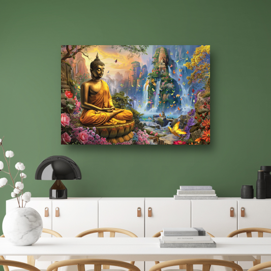 Serene Boeddha en Watervallen in Paradijselijke Natuur acrylglas