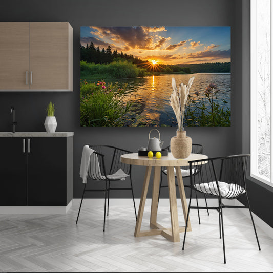 Adembenemende zonsondergang bij rustig meer canvas met baklijst