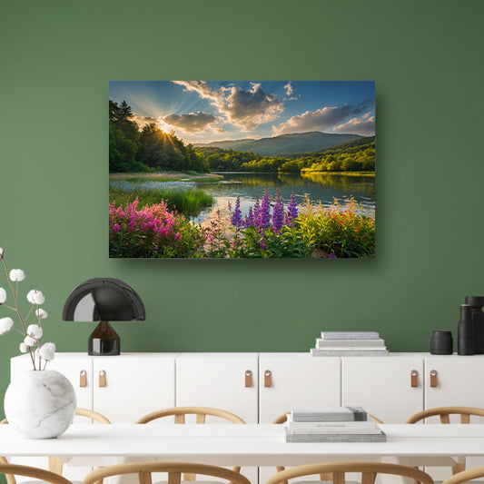 Schilderachtig zomerlandschap met bloemen en water canvas met baklijst