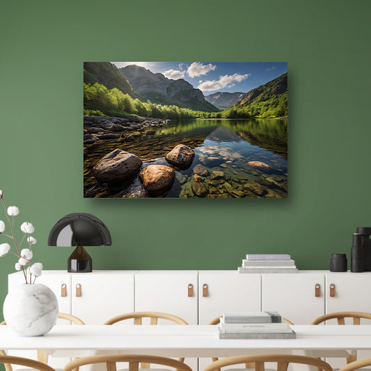 Rustig berglandschap met heldere rivier canvas met baklijst