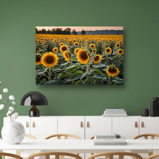 Uitgestrekt zonnebloemveld bij zonsondergang canvas met baklijst