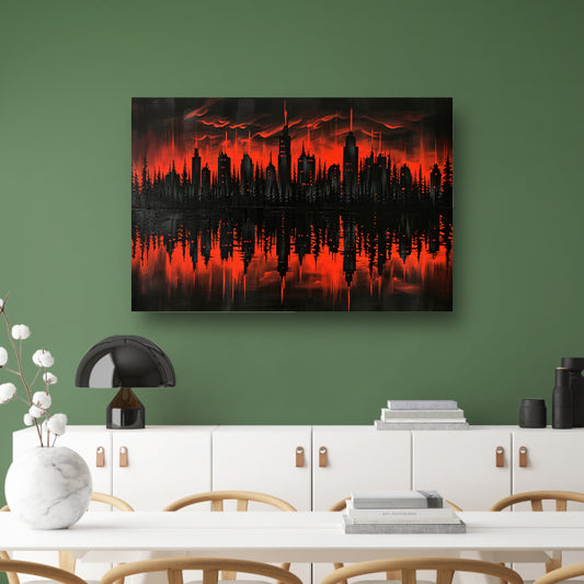 Rood-zwarte stadssilhouet bij zonsondergang canvas met baklijst