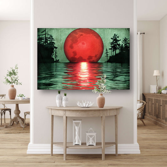 Abstracte rode zon boven water met bomen canvas met baklijst