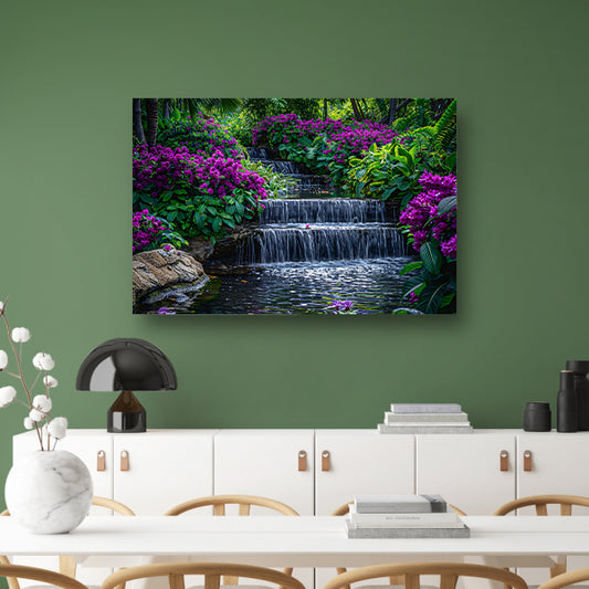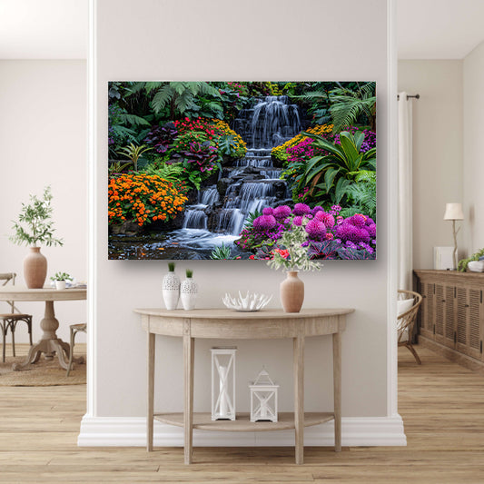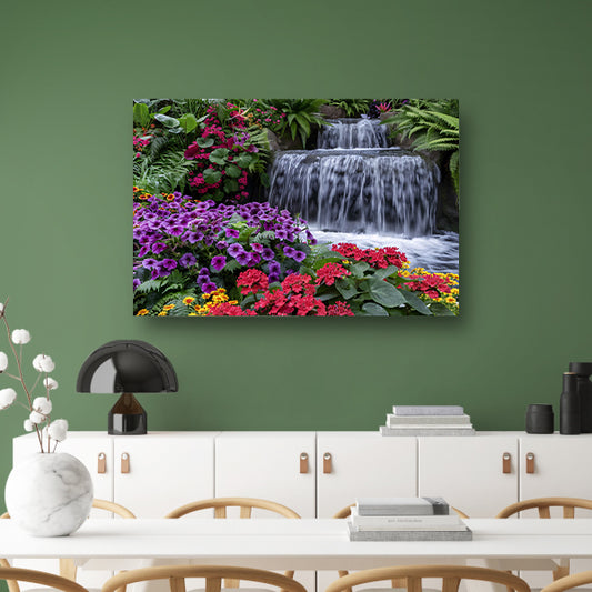 Enchanted garden with colorful flowers and cascading waterfall canvas met baklijst