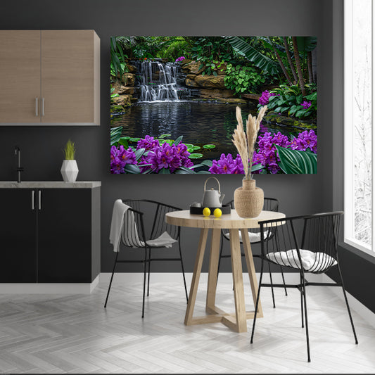 Tuin met paarse rhododendrons en watervallen canvas met baklijst
