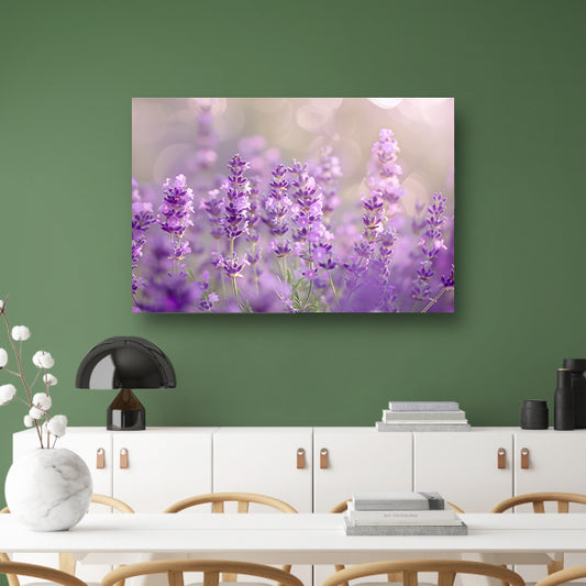 Close-up van lavendelbloemen in zachte zonneschijn canvas met baklijst