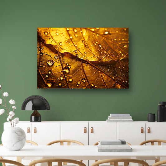 Waterdruppels op goudkleurig blad in detail canvas met baklijst