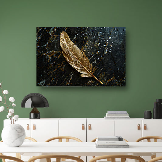 Gouden veer met waterdruppels op donker marmer canvas met baklijst